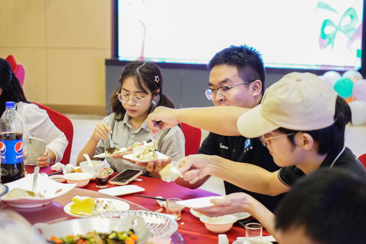 不仅如此,在吃吃喝喝的同时,游戏环节“拍气球”、“刮刮乐”也在寿星们的欢声笑语中进行着,你一言我一语,笑脸的旁边还是笑脸。说到生日,当然不能忘了美味的生日蛋糕。灯光渐暗,寿星们许下独一无二的愿望,吹灭生日蜡烛,共同品尝着甜甜的蛋糕,心中默念:愿每一岁的自己都能奔走在热爱里!