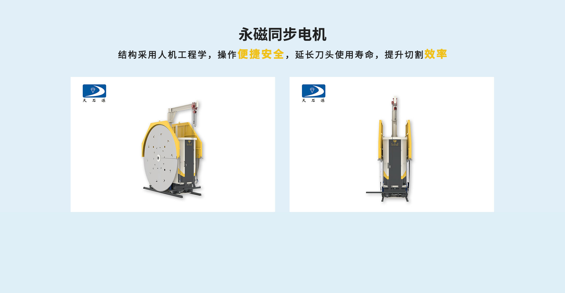电机采用变频控制,通过监测电流大小,可根据不同种类的石材荒料软硬程度来调节锯片的线速度,延长刀头使用寿命,提升切割效率。